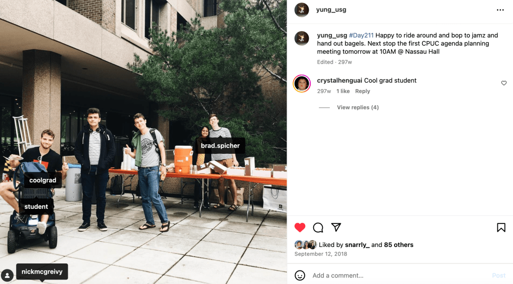 Nick “Cool Grad” McGreivy. You absolutely made a massive impression from the first time we met. I remember I was running around like a chicken with its head cut off trying to organize the First Day of School bagel handouts and was so stressed because the person who was supposed to volunteer for their bagel shift did not show up. You were kind enough to join our USG — emphasis on the “undergrad” squad– and help to greet people, hand out bagels, and make the whole crew feel like they were having a good time. I had not interacted with many grad students outside of my TAs and the GSG exec squad, so it was really cool to meet a new grad student friend organically. I am truly so thankful for our friendship over the years. You are such a thoughtful, kind, interesting person and I appreciate how you challenge me. I appreciate how reliable and loyal you are. One moment that particularly stands out is when I told you that I had an assassin coming after me in Firestone library (as part of Ivy’s assassin game) you immediately said you would come pick me up in your van thinking that it was an actual assassin and that I was in real danger. I appreciate how no questions asked you were and how much of a friend of action you were. I still chuckle at how concerned you were and how I should have absolutely given you a warning that it was part of a silly game without any real danger. One other lightbulb memory that comes to mind is when I started my 50 First Dates experiment post grad. Something you said has really stuck with me even to this day and it is noted in the bottom of my footnotes in page 11 of my “2020 Framework for Evaluating Relationship Fit” document. You told me that I needed to “go in with an open heart and be open to getting hurt or else I would never fully be vulnerable.” I took that to heart over the past 4 years and I am so much better off for it. You talked about not having a scarcity mindset and I also took that to heart. I SO appreciate your candor, authenticity, and how you approach life. Your sense of adventure is inspiring and has pushed me to reexamine what is possible. My life is indubitably better off because you are in it! Congrats Dr. Cool Grad- I can’t wait to see what you do after this!!!